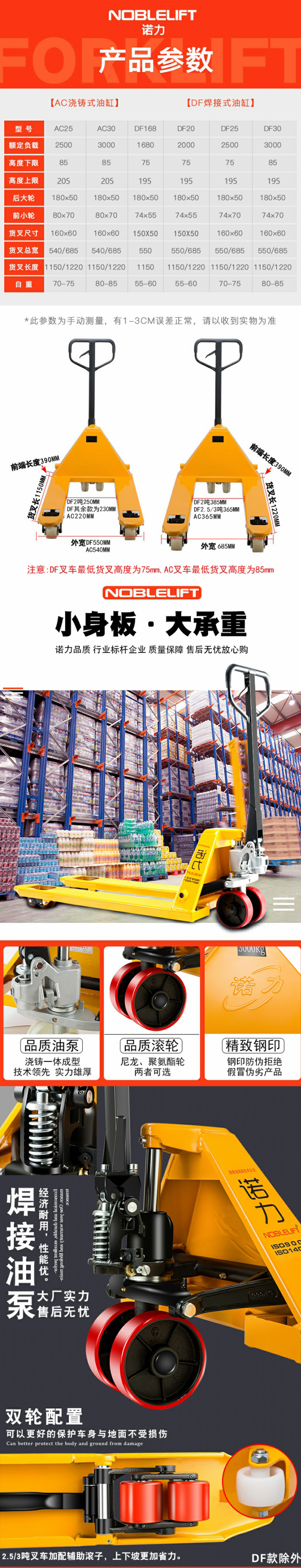 液壓手(shou)動搬運車标(biāo)準尺寸分寬(kuān)車和窄車,寬(kuān)車685*1200mm,窄⛹🏻♀️車 540*1150mm。一般(bān)來講,标準的(de)有2.0t-2.5噸-3.0t-5.0t,這4種載(zai)重量。國标的(de)托盤高度🔱一(yī)般在100mm,所以國(guó)🈲标的手動液(ye)壓搬運車低(di)高度當然在(zài)這之下。一般(ban)的手動液壓(yā)搬運車放到(dào)低點的時候(hòu)高🚶度是85mm、75mm兩種(zhǒng)。