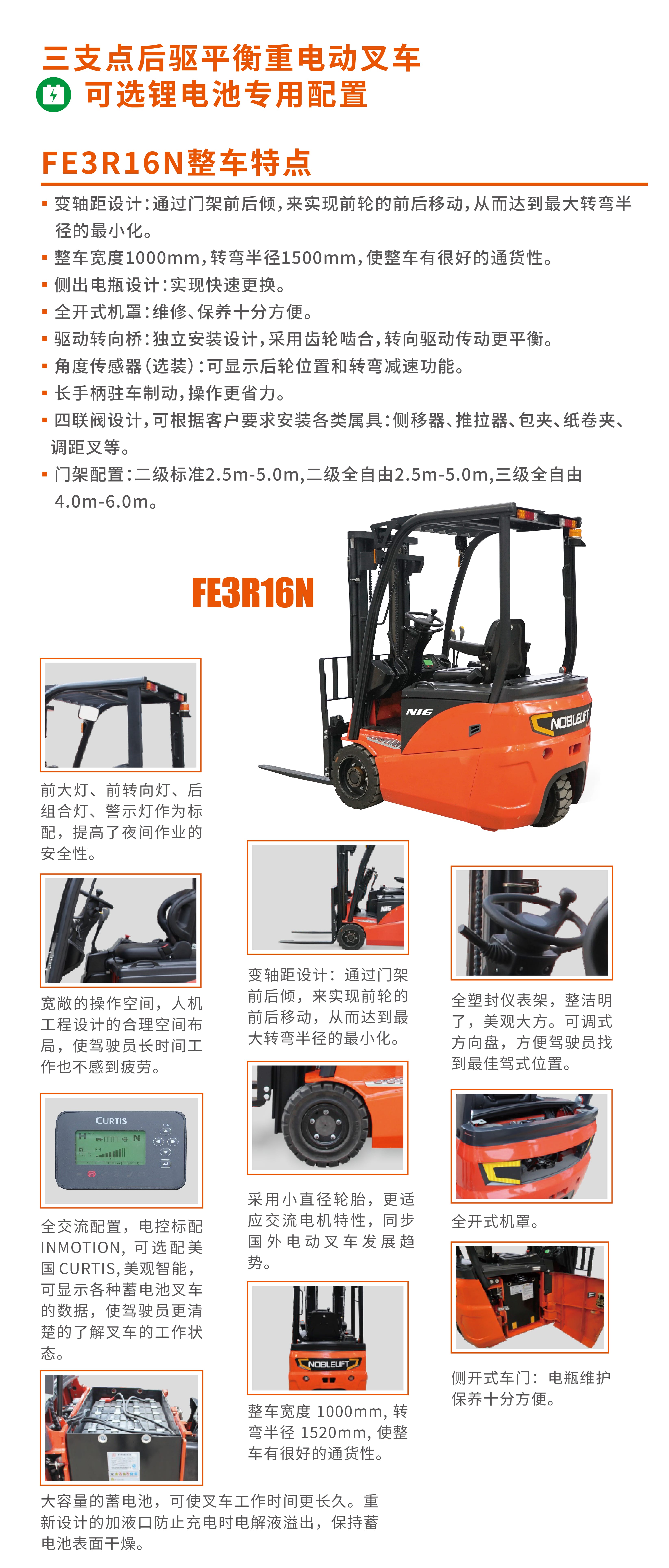 産(chan)品賣點(diǎn) 變軸距(jù)設計:通(tōng)過門架(jià)前後傾(qing),來實現(xian)前輪的(de)🔞前後移(yí)👣動,從而(er)達到大(dà)轉彎半(ban)徑的小(xiǎo)化。 整車(chē)寬度1000mm,轉(zhuan)彎半徑(jìng)1500mm,使整車(chē)有🤩很好(hǎo)的通貨(huo)性。 側出(chū)電瓶設(she)計:實現(xian)快速更(gèng)換。 全🏃♂️開(kai)式機罩(zhao):維修、保(bao)養十分(fen)方便。 驅(qu)動轉向(xiang)橋:獨立(li)🌈安裝設(shè)計,采用(yòng)齒輪齧(niè)合,轉向(xiàng)💞驅動傳(chuán)動更平(ping)衡。 角度(du)傳感器(qì)(選裝):可(kě)顯示後(hòu)輪位☁️置(zhì)和轉彎(wān)減速功(gōng)能。