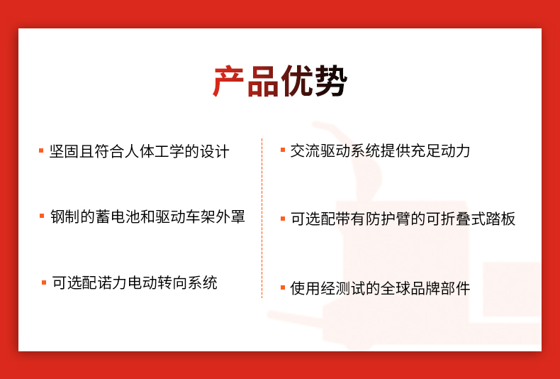 經濟型電動搬(bān)運車 産品賣點 堅(jian)固且符合人體工(gong)學設計 鋼制㊙️的蓄(xu)電車和驅動車架(jia)外罩 可選配諾力(li)電動轉向系統 交(jiāo)♍流驅動系統提供(gong)充足動力 可選配(pei)帶有防護臂的可(kě)折疊式踏闆 使🍉用(yong)經測試的全球品(pin)牌部件