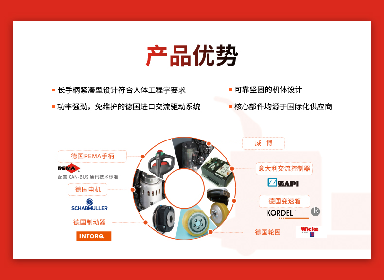 經濟型(xing)電動搬運(yun)車 産品賣(mài)點 長手柄(bǐng)緊湊型設(shè)計符合人(ren)體工程學(xué)要求 功率(lü)強勁,免維(wei)護的德國(guó)交流驅動(dong)系統 堅固(gù)的機體設(shè)計 核心部(bù)件均源于(yú)化供應商(shāng)