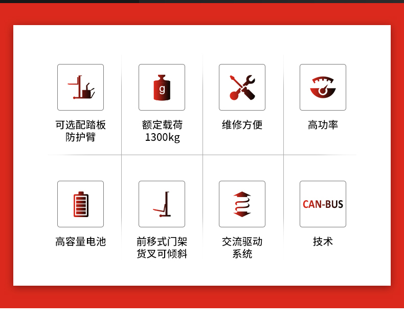 産品賣點 高容量(liang)電池 交流驅動技(jì)術 貨叉可傾斜 選(xuǎn)配側移🧡功能 選配(pèi)側拉式電池