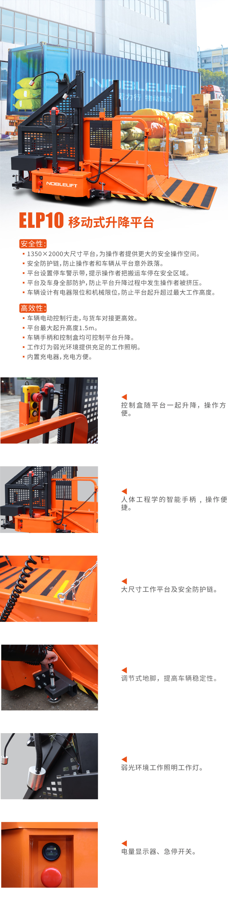 産品(pǐn)賣點 車輛電(dian)動控制行走(zou),與貨車對接(jiē) 工作燈爲弱(ruò)光環境提供(gong)充足的工作(zuo)照明 調節式(shì)地腳,提❌高車(che)輛穩定性 控(kòng)制盒随平台(tái)一起操作方(fang)便 人體工程(cheng)學智能手柄(bing) 大尺寸工作(zuo)平台及安全(quán)防護鏈