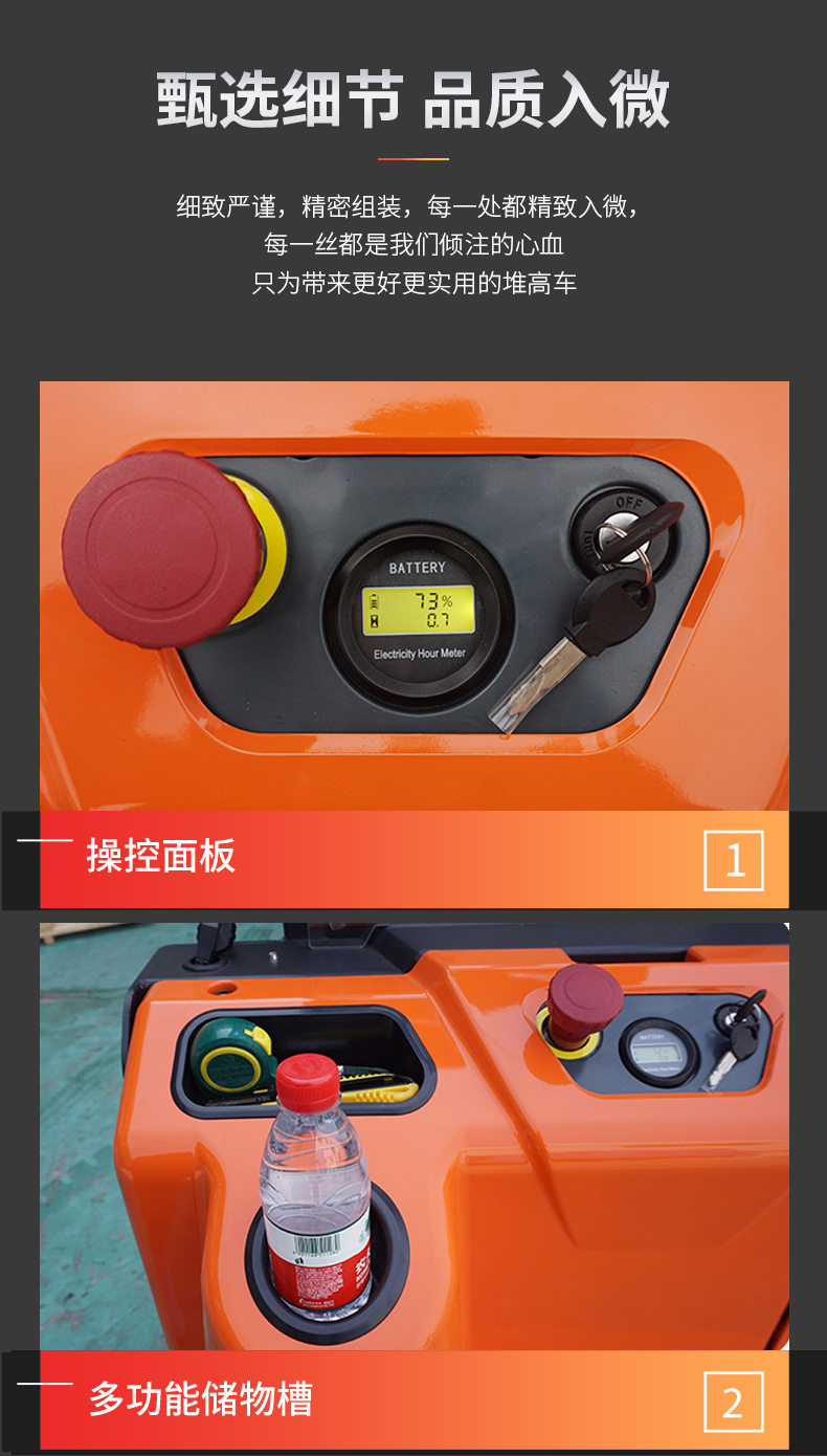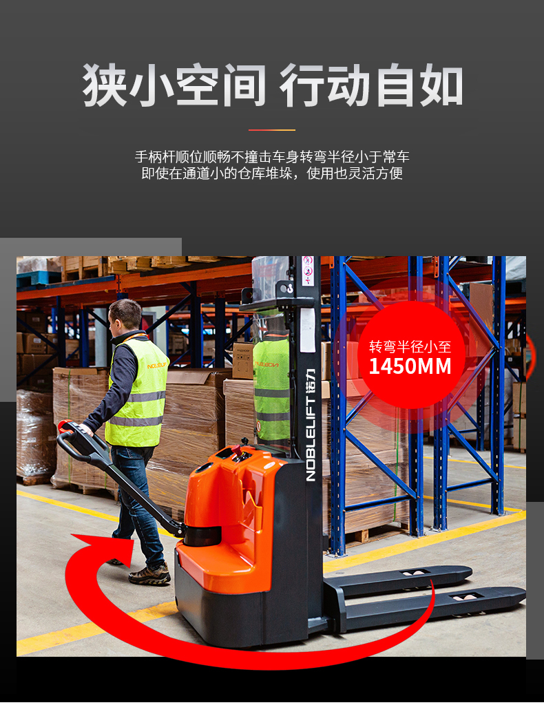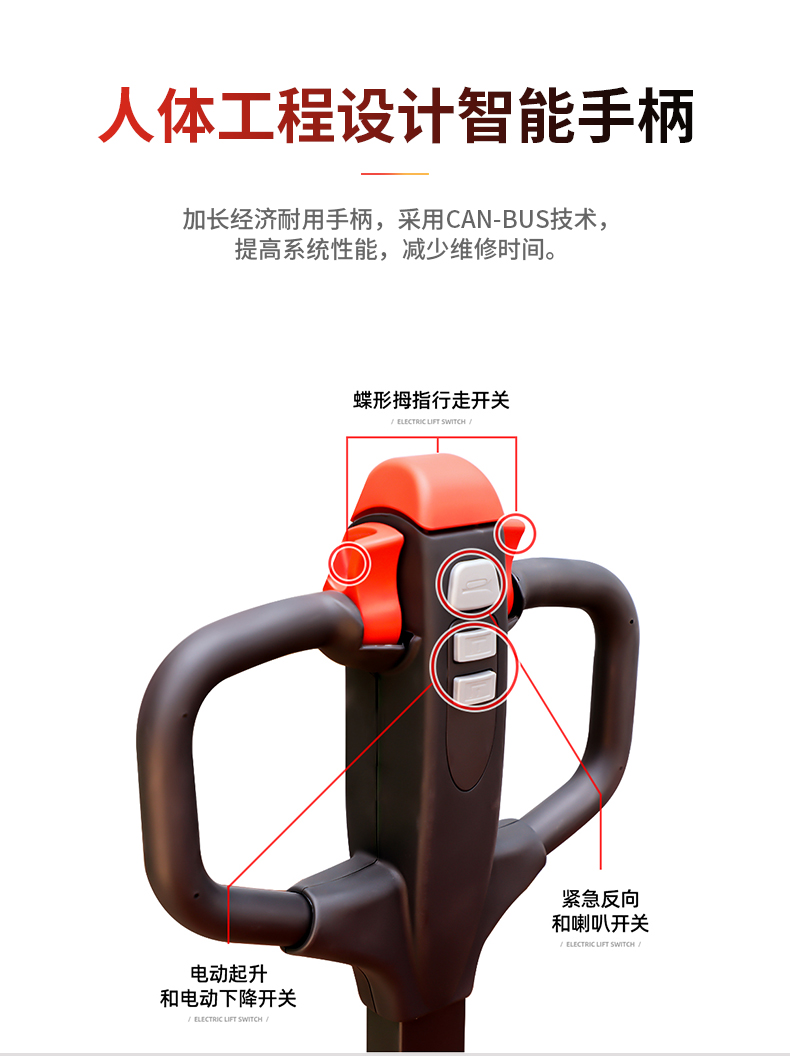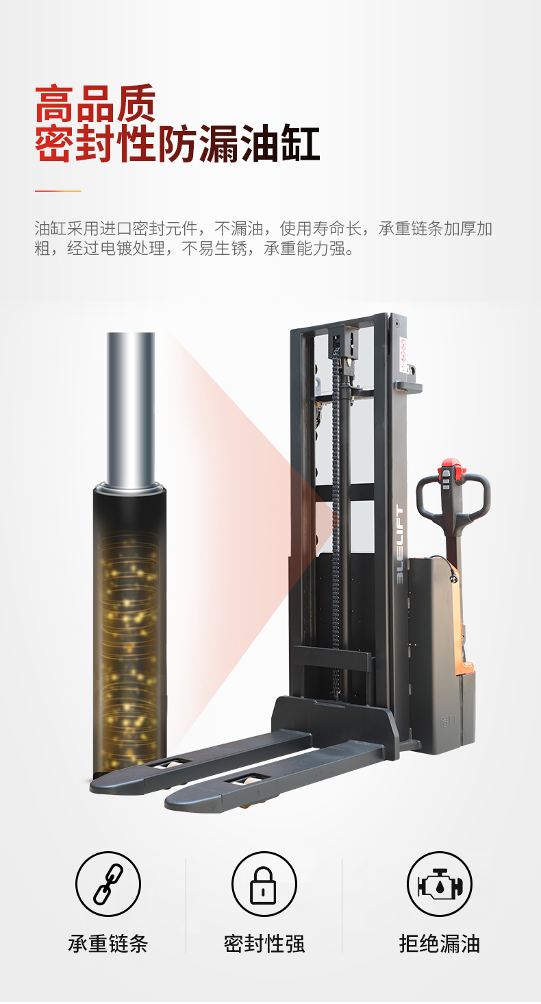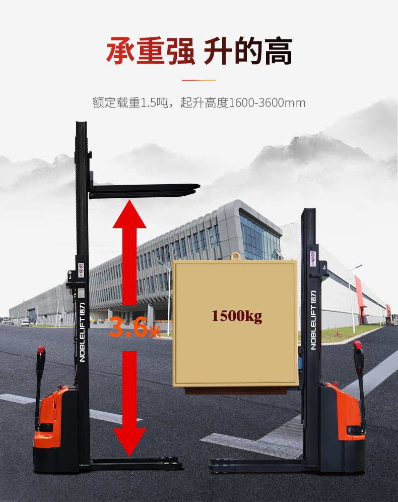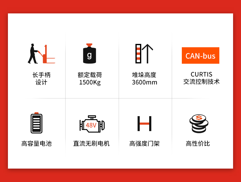 産品賣點(dian) 長手柄設計(ji) 額定載荷1500kg 堆(dui)垛高度3600mm CURTIS交流(liu)控制技術 高(gāo)容量電池 直(zhi)流無刷電機(ji) 高強度門架(jia)