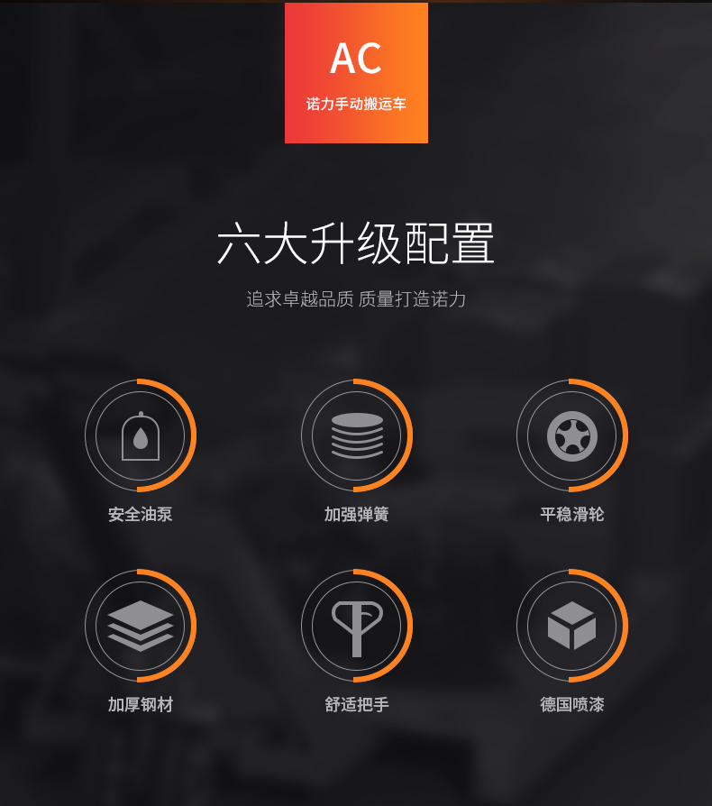 産品賣點(dian) 精簡耐用(yong),匠心品質(zhi)的搬運車(che) 是各種超(chāo)市、倉庫和(he)工廠段距(jù)離手動搬(bān)運貨物的(de)理想選擇(ze) 材料選用(yòng)加強型鋼(gāng)🔅材,堅固耐(nai)用,外形精(jīng)緻美觀。德(de)國标準WAGNER噴(pen)塗系👈統确(què)保⭐的噴塗(tú)質量 所有(you)的轉軸處(chu)都加以潤(rùn)📞滑,确保良(liáng)好的操作(zuo)性和輕松(sōng)的轉向。複(fú)🌈合套和鍍(du)鉻的軸确(que)保了安靜(jìng)平穩的起(qi)升和行走(zou),是用壽命(ming)長
